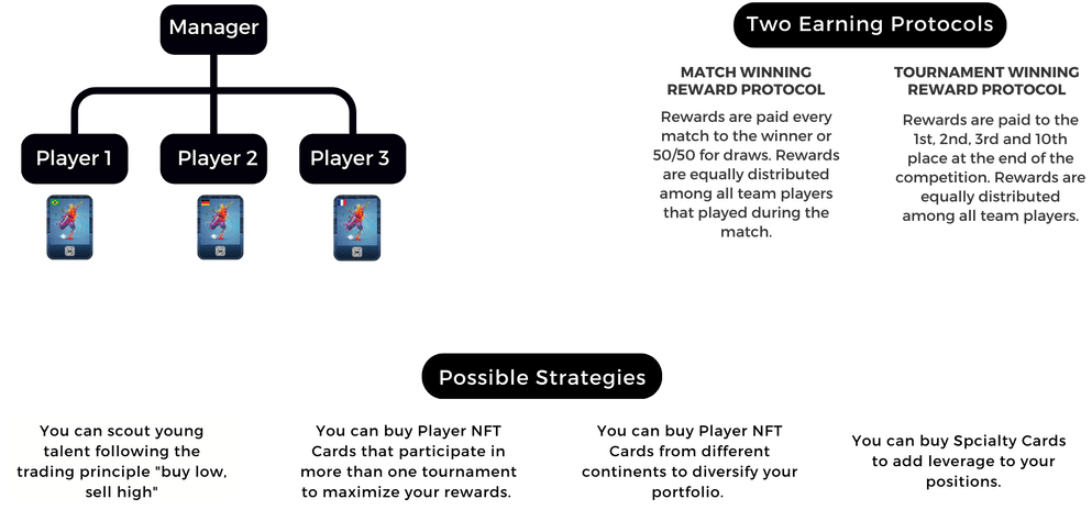 Every Player Card is unique and has chances of receiving a reward, based on real-life sports results. The card comes with an acronym that creates a code to ID the player.The Player Cards will display a jersey, which is a wearable for the metaverse and will contain ads from our sponsors, so you can make a side profit on top of your earnings.By holding your Player Card you get passive income for participating in competitions, basically forever, until the player that is represented in your Player Card gets retired.